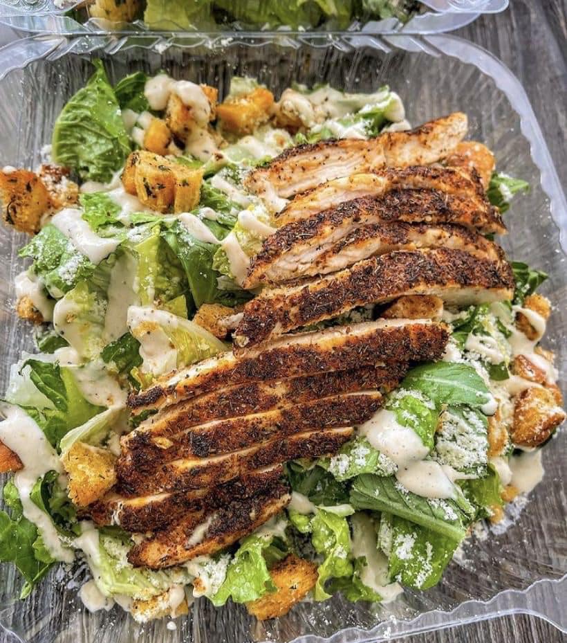 - Top with sliced grilled chicken, bacon, croutons, and shaved Parmesan.