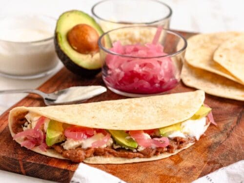 Warm tortillas on a skillet if needed. Spread a generous spoonful of refried beans onto one half of each tortilla. Add crema and sprinkle with cheese. Top with grilled meats—either individually or combined for a “baleada mixta.” Add optional toppings like avocado slices or pickled onions.