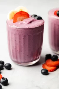 Blend 1 cup frozen mixed berries, ¾ cup plain Greek yogurt, 1 scoop unflavored collagen protein, 1 tbsp flaxseed, and 1 cup water. Berries provide antioxidants to reduce oxidative stress, while Greek yogurt delivers casein and whey for extended muscle repair. Flaxseed supports hormone balance and heart health. Collagen protein promotes joint recovery, making this shake ideal after intense resistance training. Its tart and refreshing taste makes recovery delicious and effective.